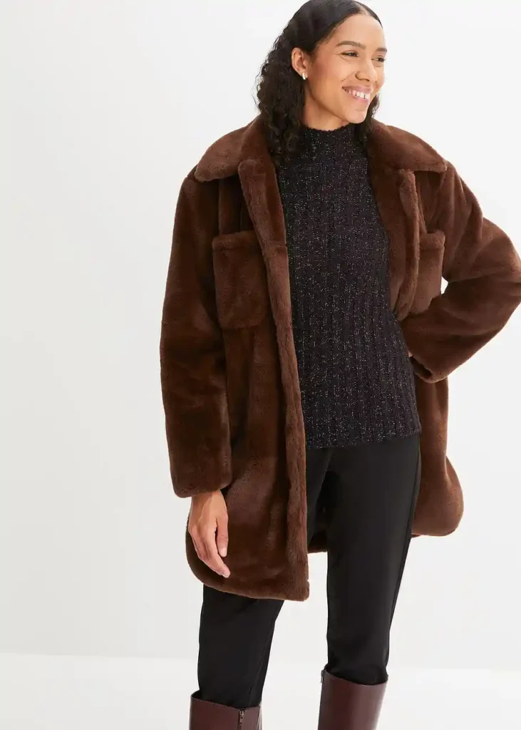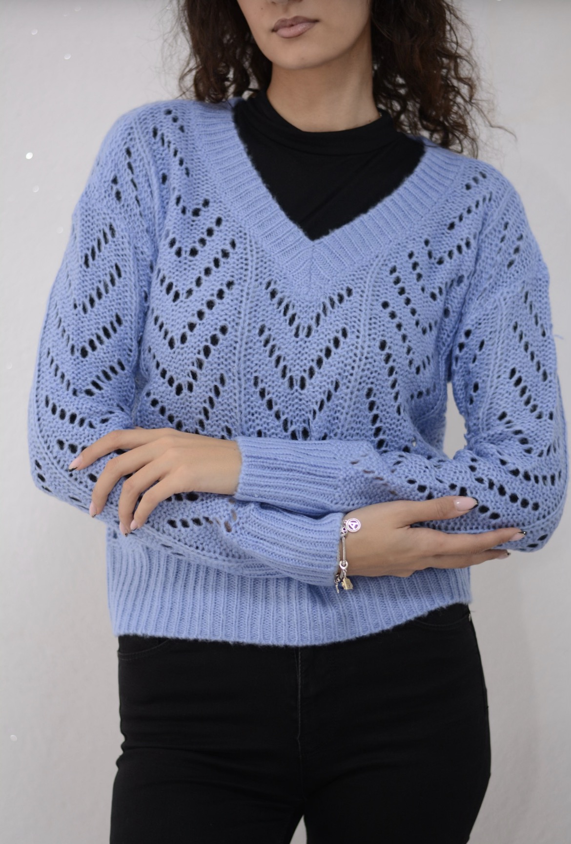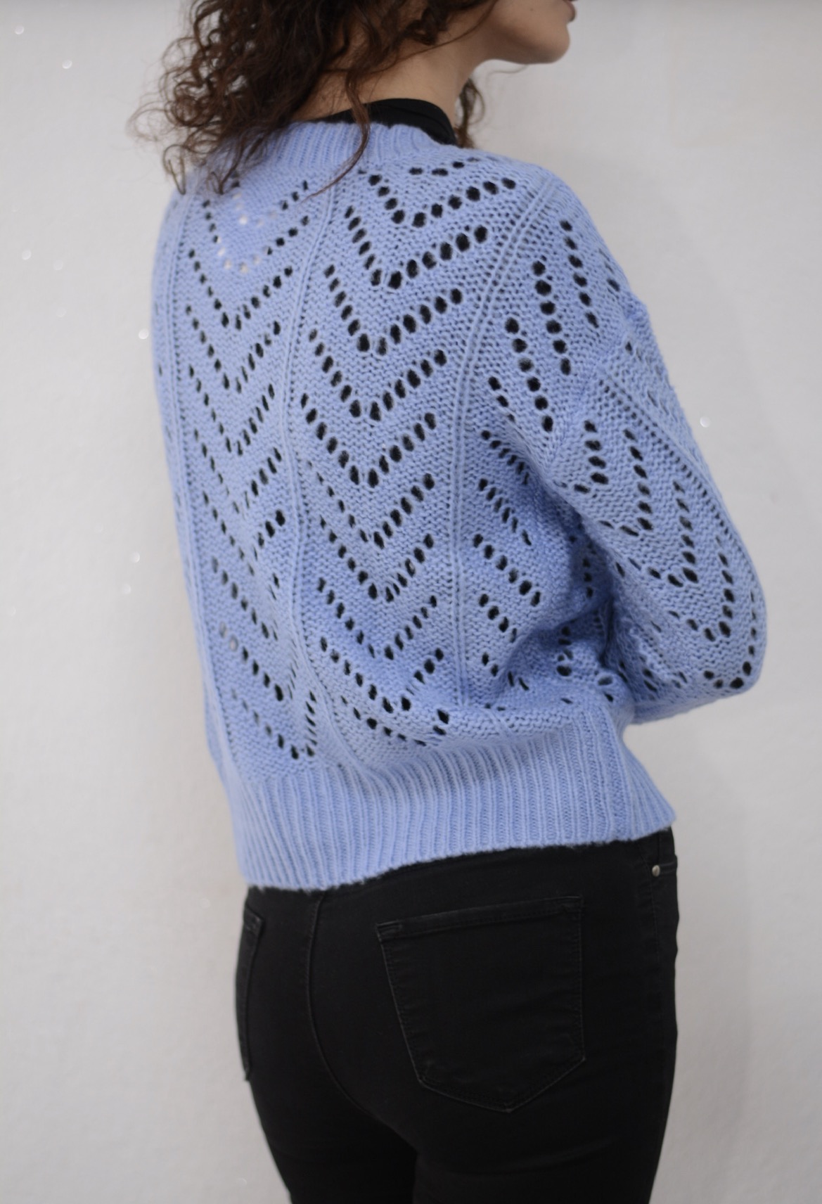 Moderan džemper sa spuštenim ramenima i blago prozirnim pletenim uzorkom. Kratko rezana, ima rebrasti rub i manšete.